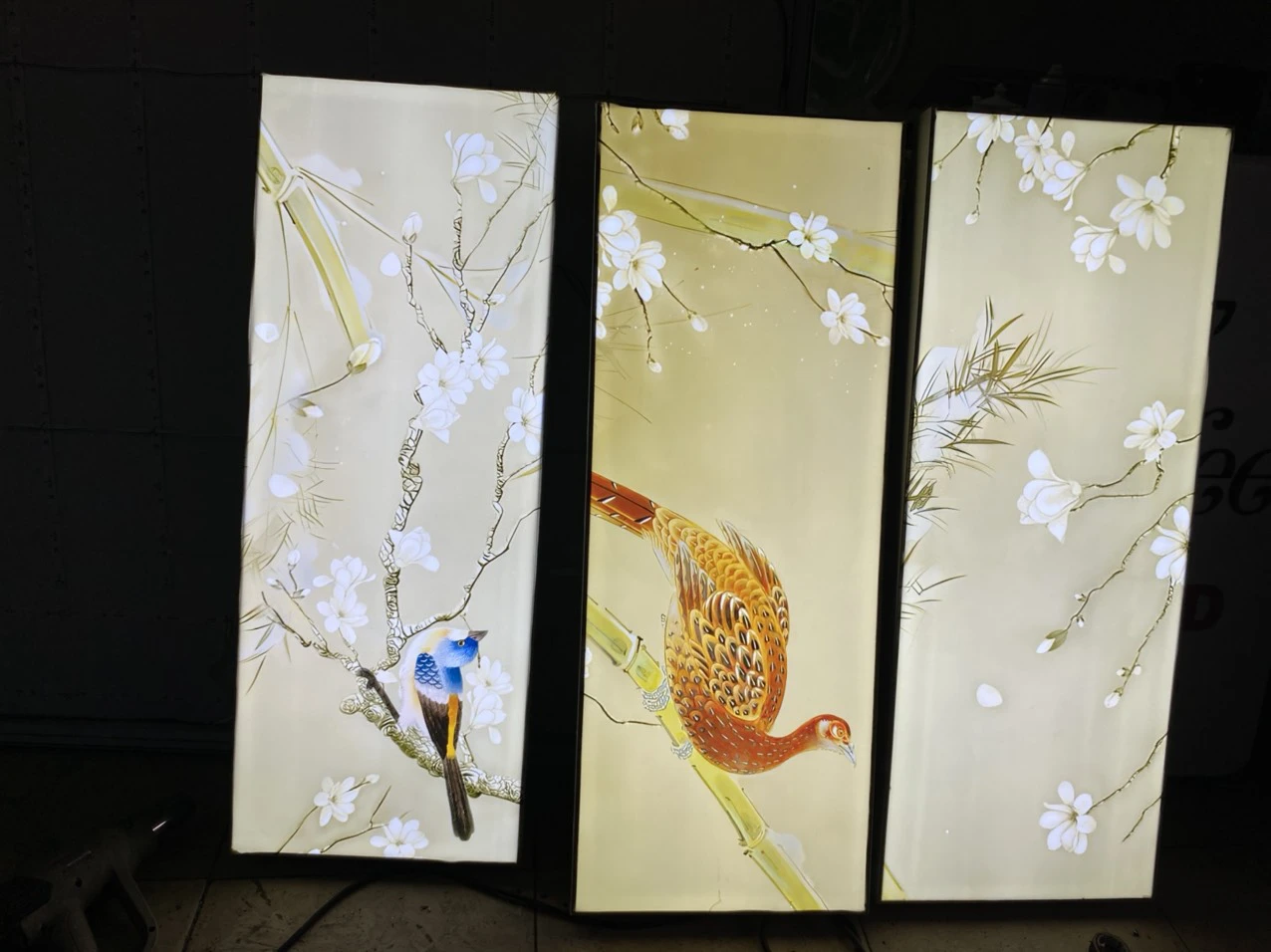 Phía sau tấm tranh là tấm mica dẫn sáng có độ dày 3,6mm . Toàn bộ tấm mica này được phủ 1 lớp phản quang dẫn sáng giúp cho ánh sáng có thể tỏa khắp mọi bề mặt tranh. Đây là yếu tố then chốt để tạo nên bức tranh đẹp .